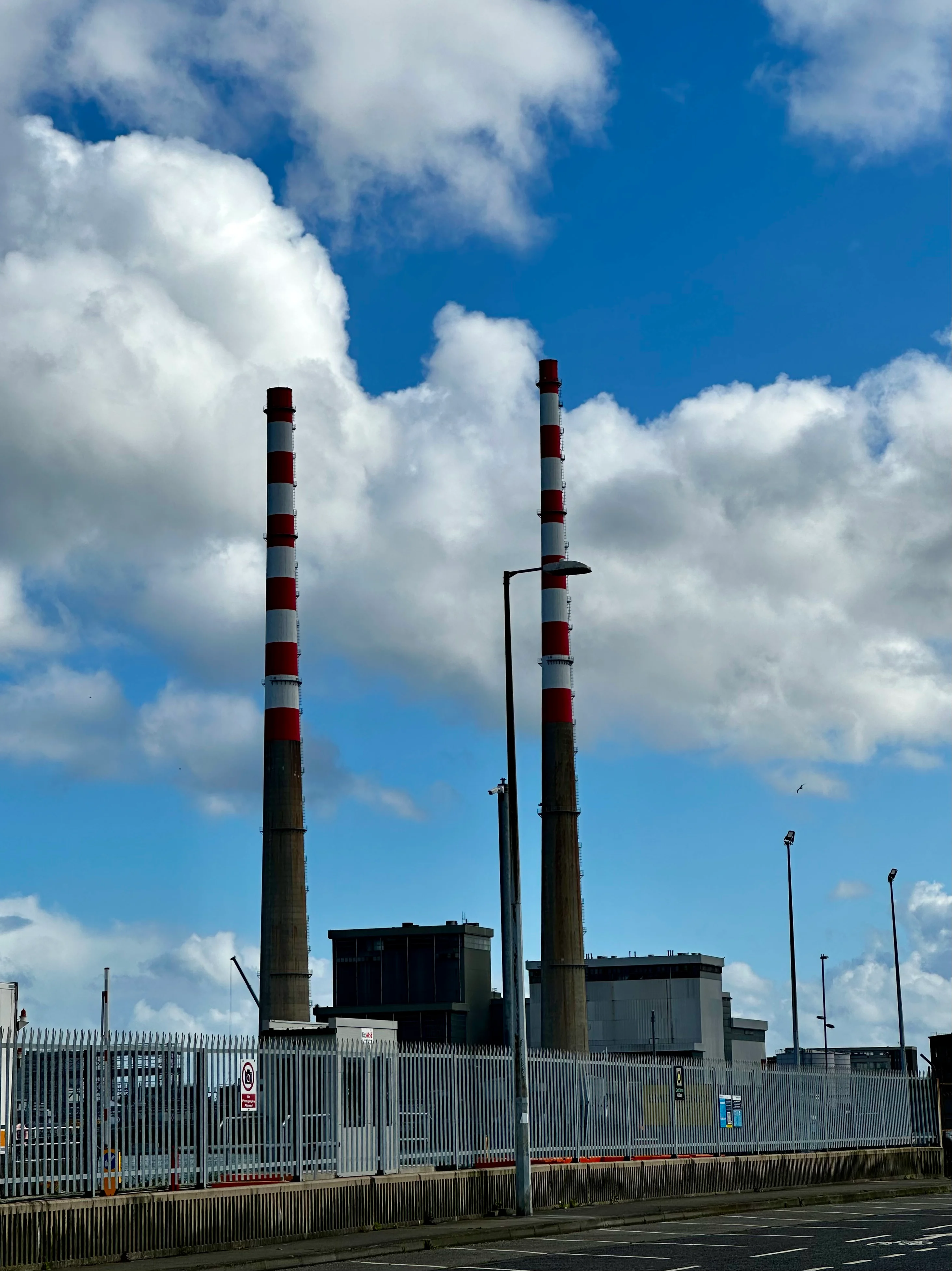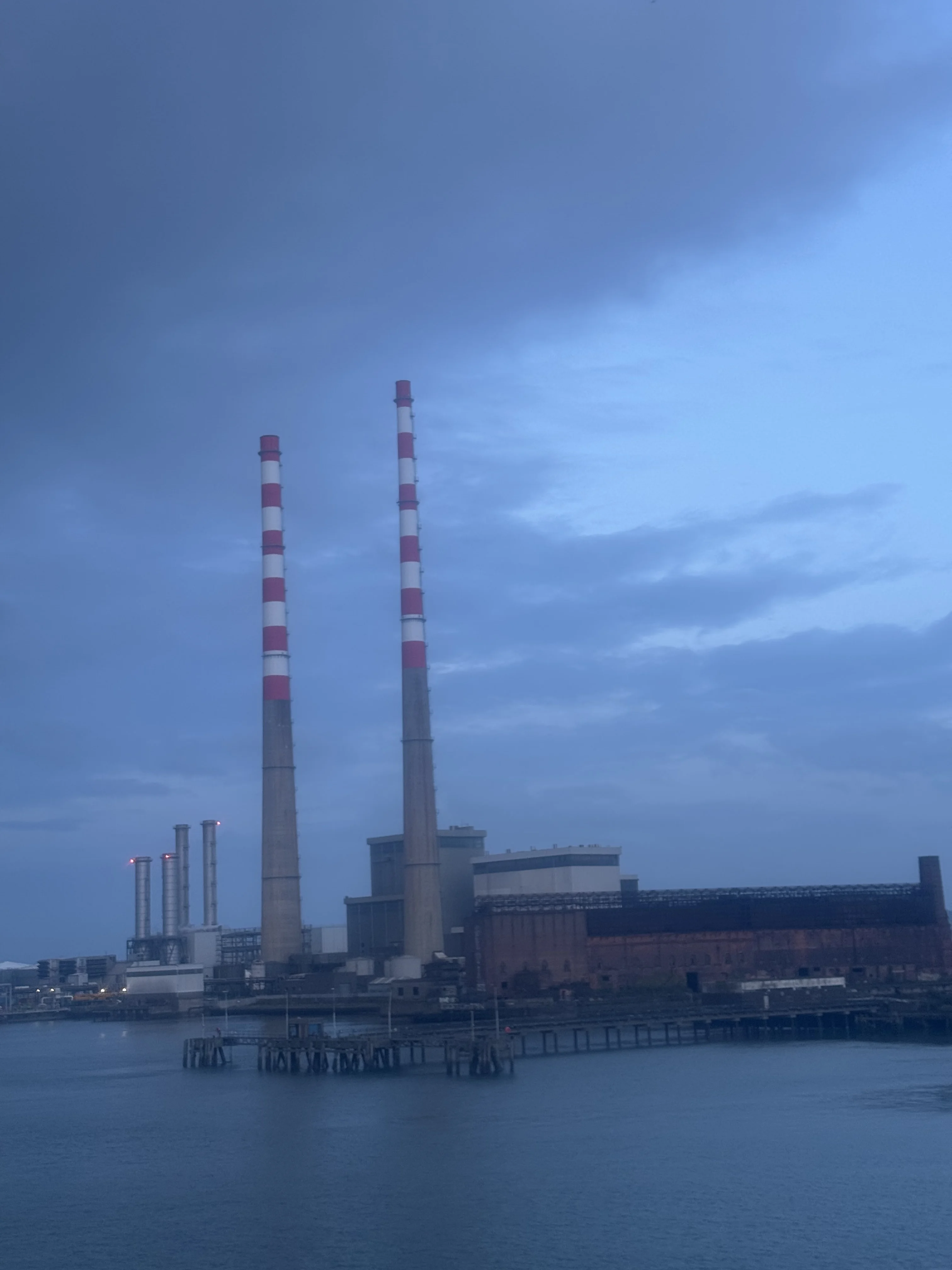 (The waiting area for the ferry is right beside the old ESB chimneys. Look at that beautiful blue sky! All is well here…)