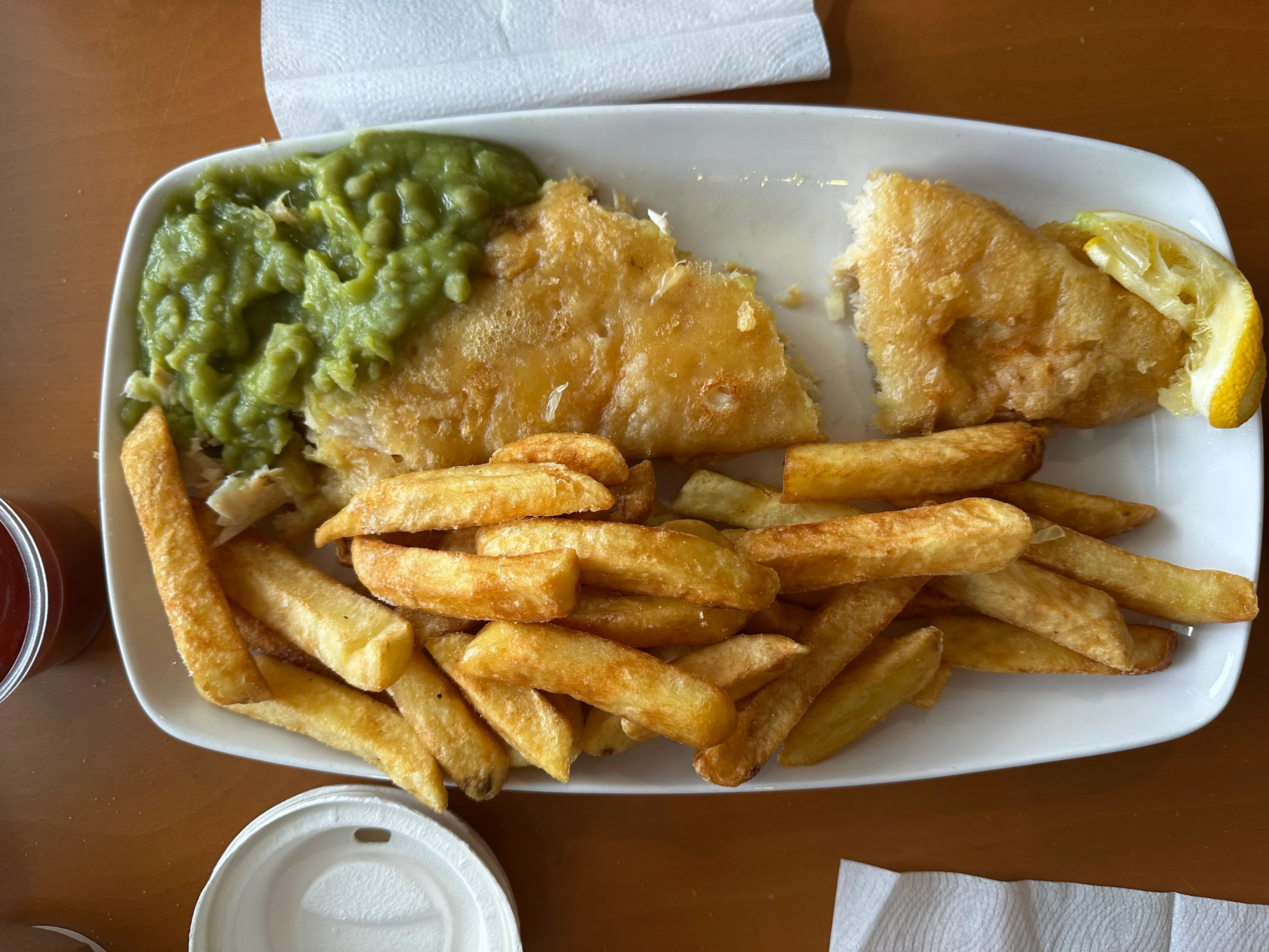 Sleep would be good, lights off, eye mask secured, night, night. Denis woke me when he got back from breakfast then he fell fast asleep full and happy. Not the first time I’ve thought - isn’t it grand for him? But I fell back to sleep too so I stopped thinking badly of him. Time passed and about 3pm the captain had a new message. Good news - we have rounded Land’s End and the side to side rolling will ease. Bad news - because we are going so slow - for your comfort and safety - we will not make it to Cherbourg before the port closes but we will make it by the time it opens again at 6.30am. Good news - dinner will be served in about 90 minutes I hope you are feeling more comfortable now and apologies for the delay, your comfort and safety is our main concern. Dinner? Are you joking? Guess who was ready for dinner? Yes, Denis. But as the rolling had eased I was happy to go too and search out the mint tea and ginger biscuit. Of course there was still the problem of the wet trousers. Yup, I went back to the restaurant in my pjs. The tea and biscuits were delicious. I was hungry. When dinner was served Denis shared some of his battered cod and chips with me and it was delicious.