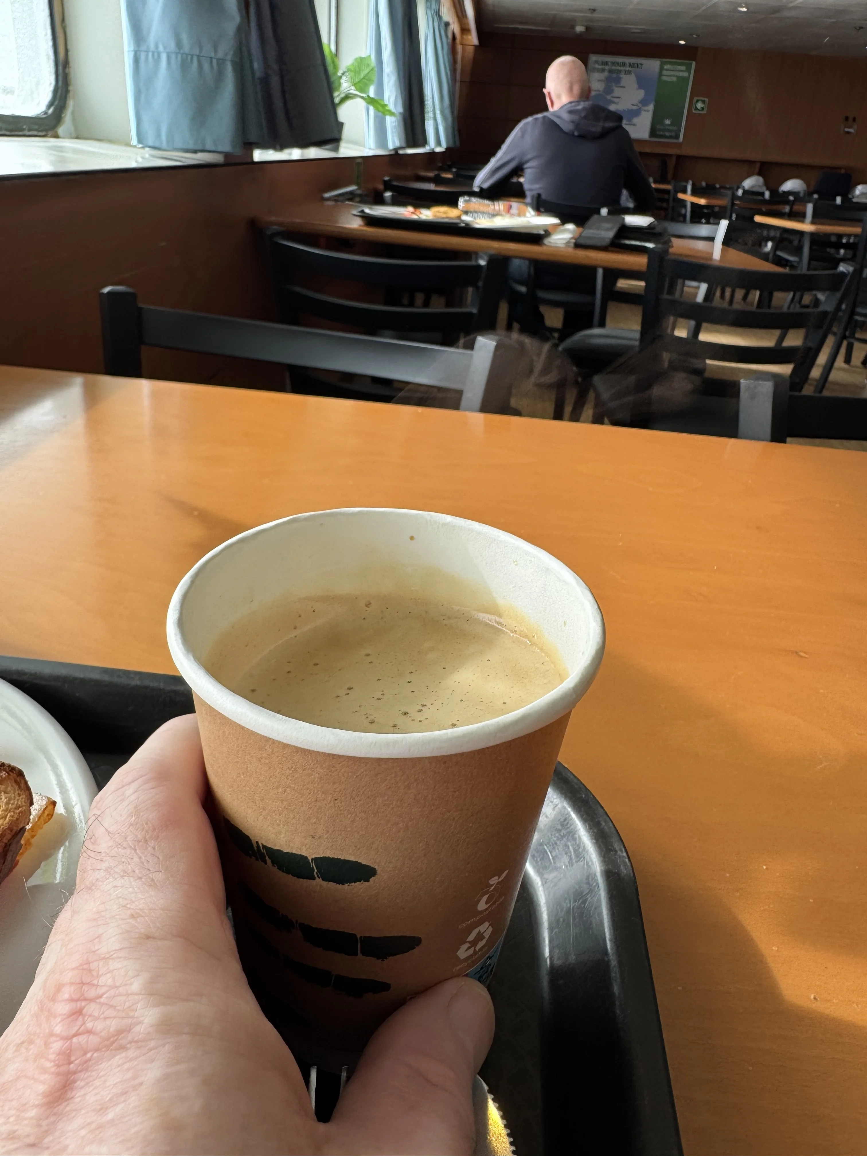 Do you remember the water bottle earlier, rolling around the floor? It had managed to empty itself while at the same time my trousers having fallen to the floor in exactly the same spot, mopped up the water. They were sopping. Now, although I had packed more than one trousers for this trip they were all locked away in the van, on the car deck, also locked. I had nothing else to wear. Denis looked at me and I looked at him, we were both thinking of solutions. It slowly dawned on me that there was only one solution. Denis offered to go up for breakfast and afterwards come back and give me his trousers so I could go up for my tea and ginger biscuits… Although I did think long and hard about that option (no I did not) my option (also not ideal) would have to do. And that is why I set off to the restaurant wearing my pyjamas bottoms. Mortified.